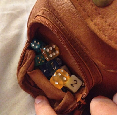 Plastic sandwich bags or small change purses can serve as bags for dice, counters, and other gaming supplies. However, I like that I've found a bag with little zip pockets on the outside for these tiny items, as seen below: